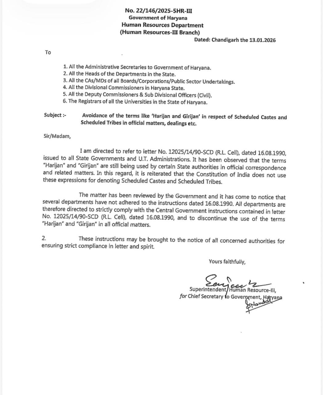 राज्य सरकार ने अपने आदेश में स्पष्ट किया कि भारत का संविधान अनुसूचित जातियों और अनुसूचित जनजातियों के संदर्भ में ‘हरिजन’ या ‘गिरिजन’ जैसी अभिव्यक्तियों का उपयोग नहीं करता। पत्र में कहा गया है कि भारत सरकार पहले ही इन शब्दों के प्रयोग पर रोक लगा चुकी है। हरियाणा सरकार उन्हीं निर्देशों का पालन करते हुए यह आदेश जारी कर रही है।