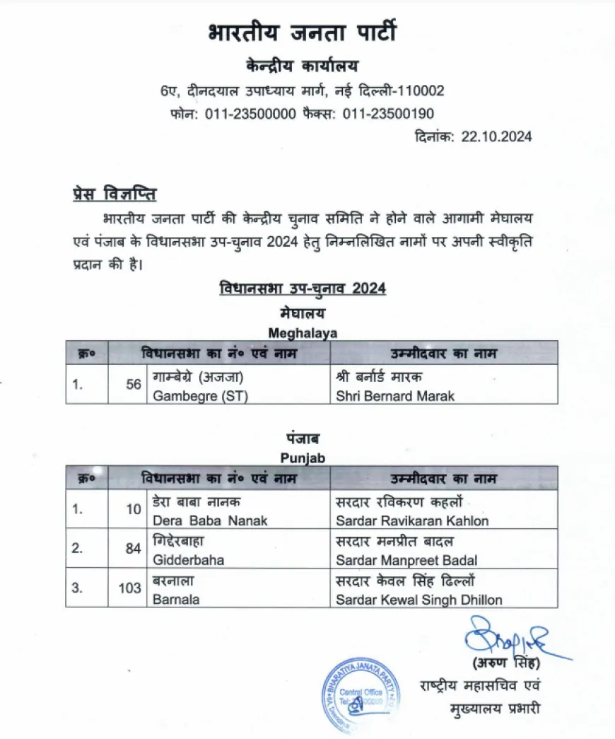 पंजाब में होने वाले उपचुनाव के लिए BJP ने अपने 3 प्रत्याशी के नाम का एलान किया